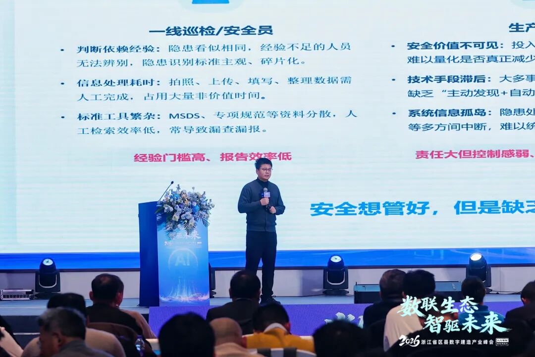 宇泛智能科技股份有限公司国内运营中心副总经理徐宇杰,则直击施工现场最核心的安全管控痛点,分享了《基于安全生产大模型在复杂建造场景的隐患自动分析与闭环管理实践》。